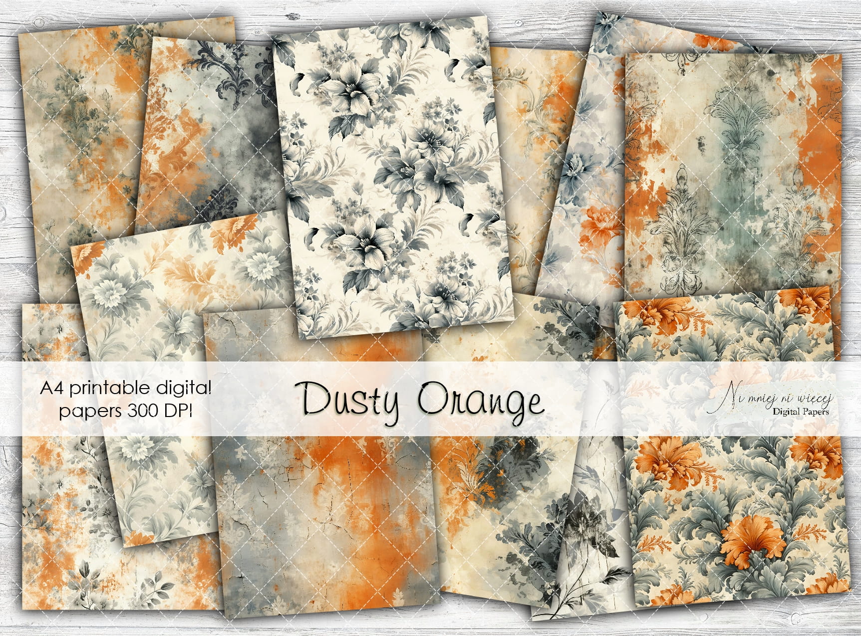 Kolekcja "Dusty Orange" zawiera 12 arkuszy plików cyfrowych do wydruku w rozmiarze kwadrat. Pliki są wysokiej jakości 300DPI.