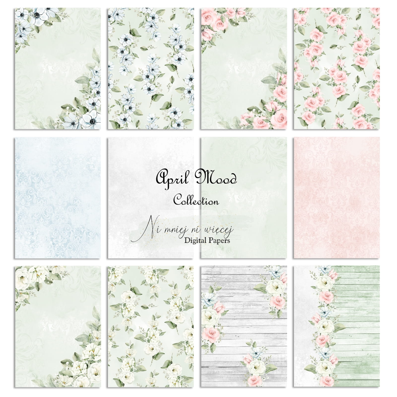 Kolekcja "April Mood" zawiera 12 arkuszy plików cyfrowych do wydruku w rozmiarze A4. Pliki są wysokiej jakości 300DPI, pod wydruk A4.