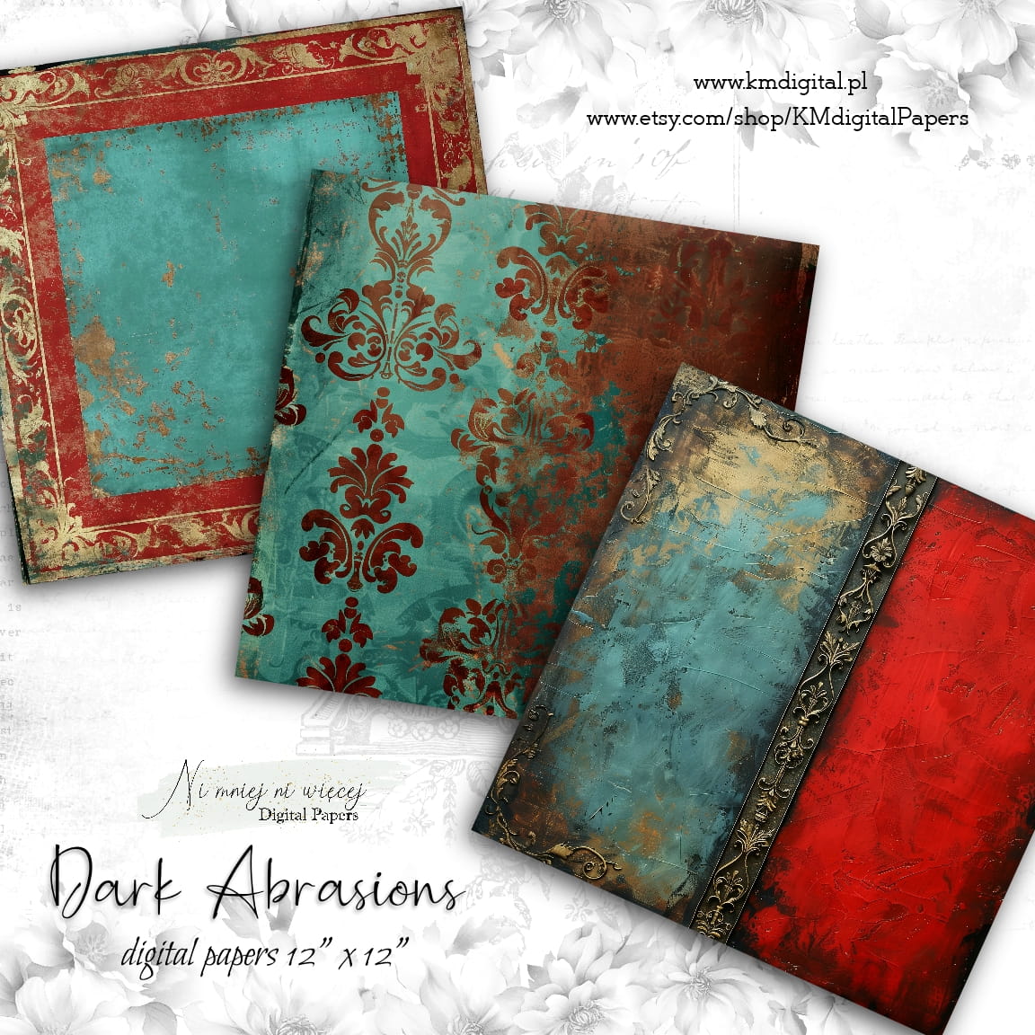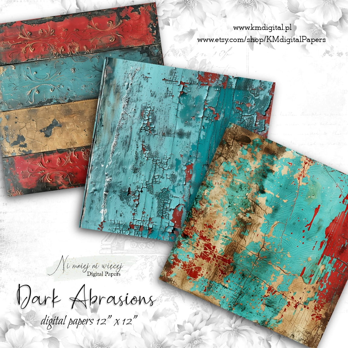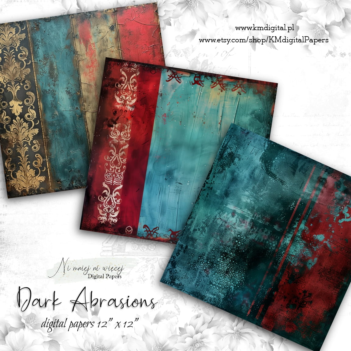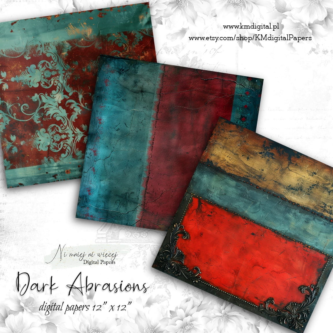 Kolekcja "Dark Abrasions" zawiera 12 arkuszy plików cyfrowych do wydruku w rozmiarze kwadrat.