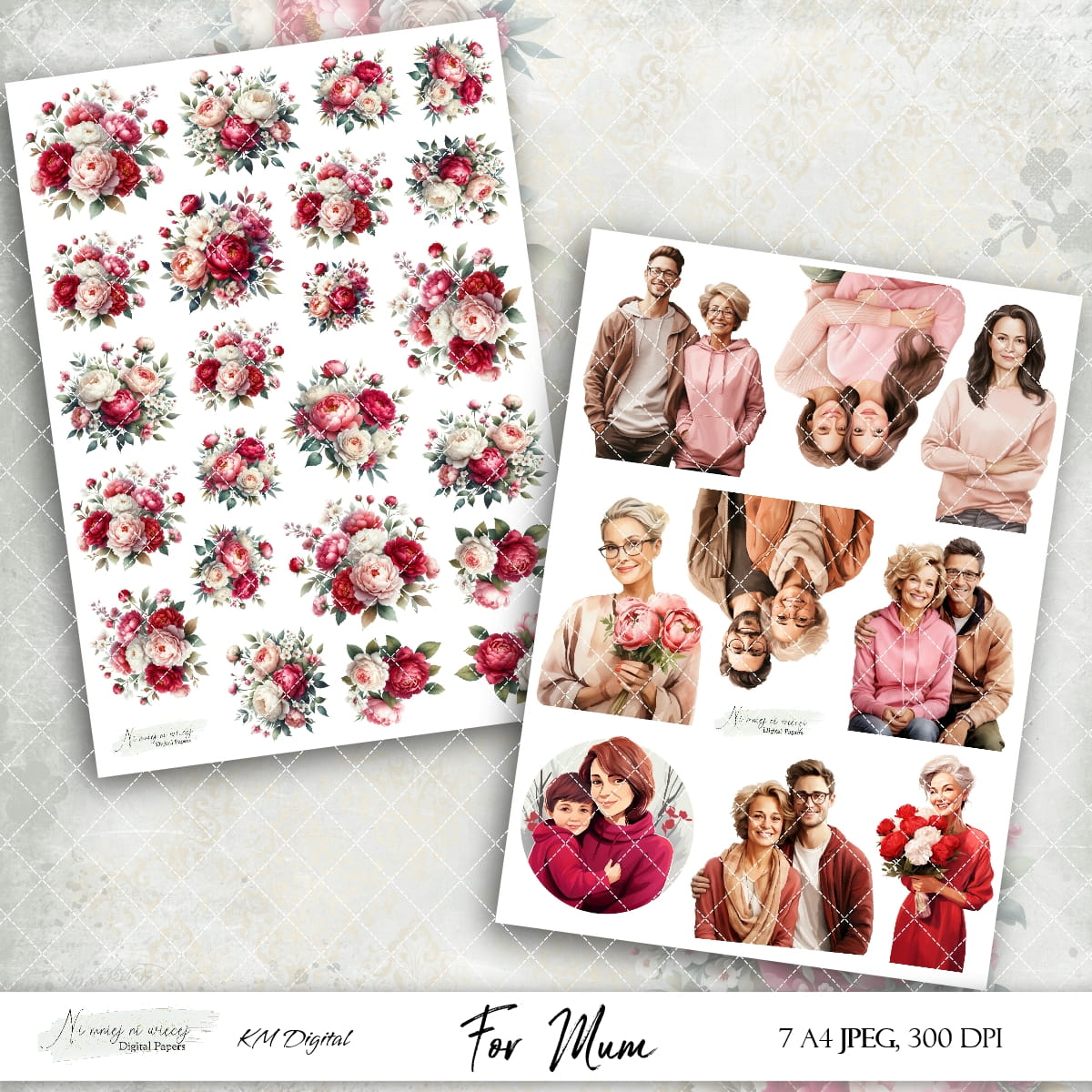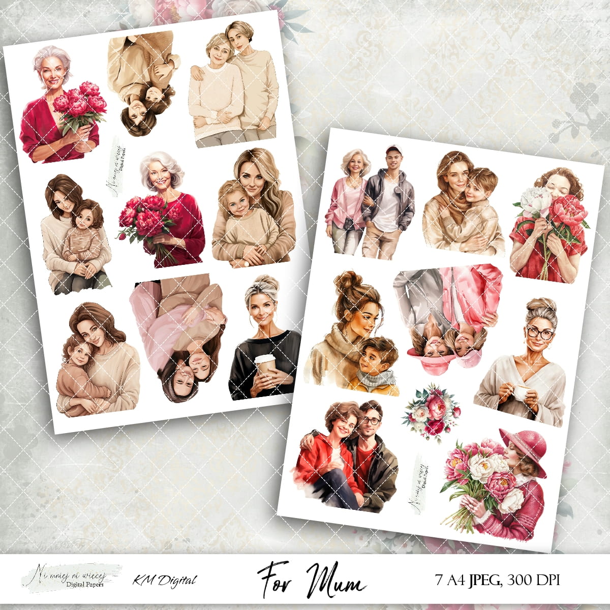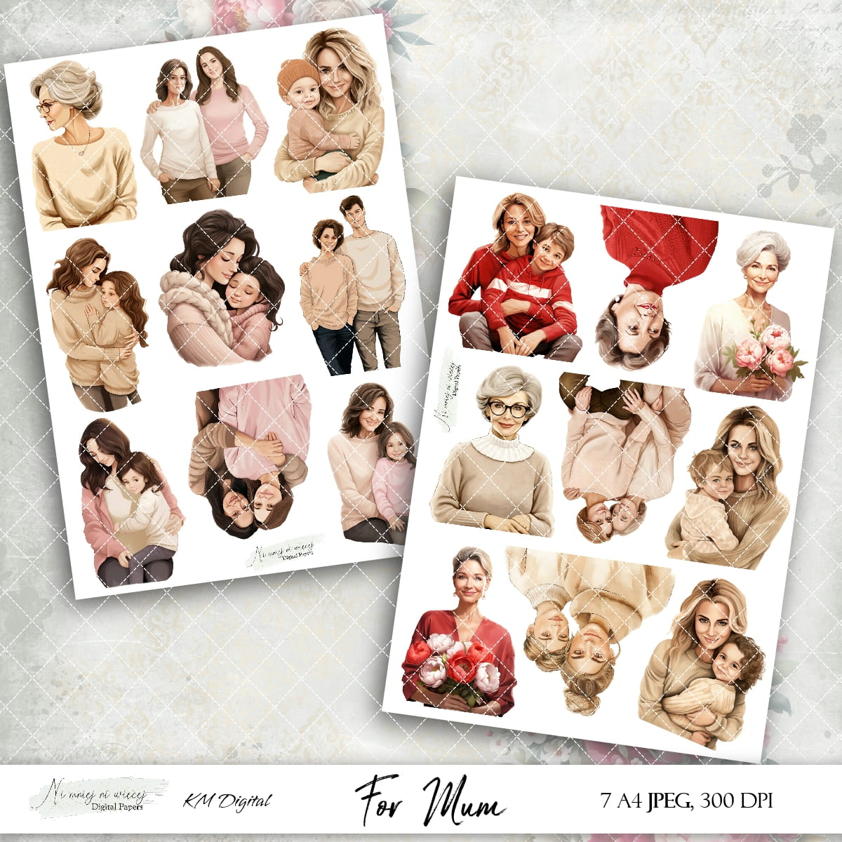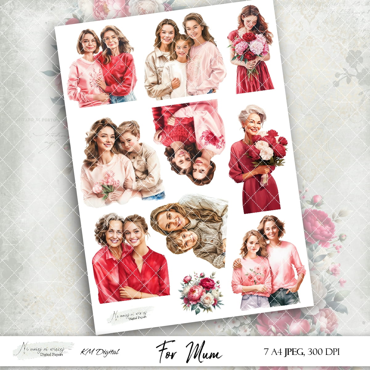 Kolekcja "For Mum" zawiera 7 arkuszy A4 JPEG grafik do samodzielnego wydruku. Pliki są wysokiej jakości 300DPI.