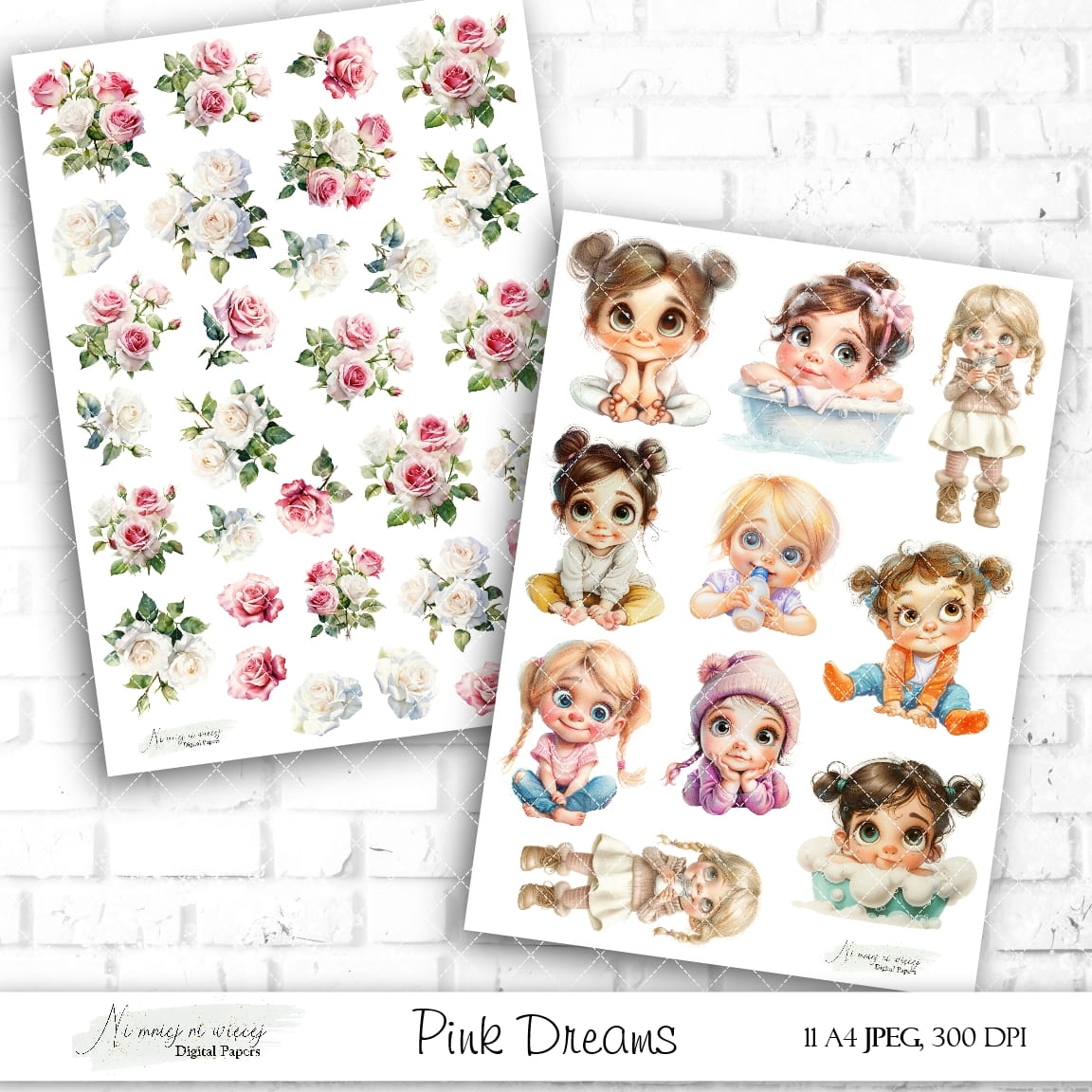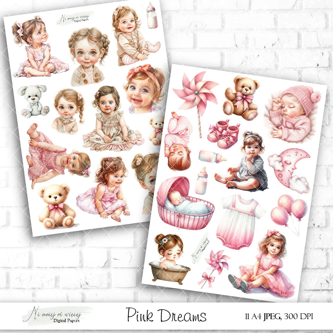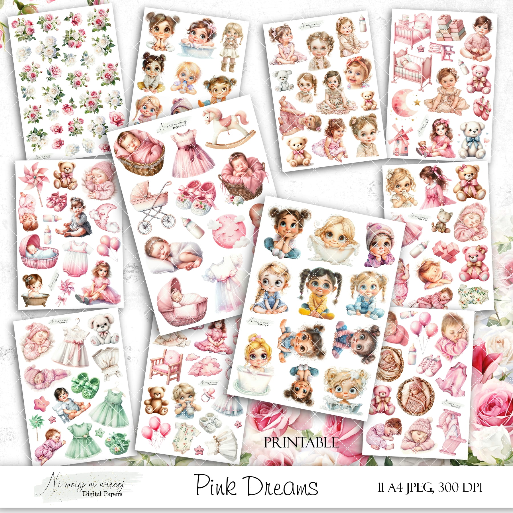 Kolekcja "Pink Dreams" zawiera 11 arkuszy A4 JPEG grafik do samodzielnego wydruku i 132 grafiki png. Pliki są wysokiej jakości 300DPI.