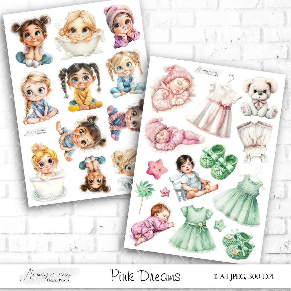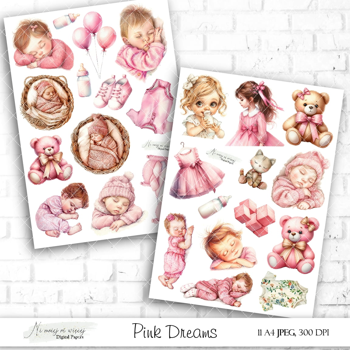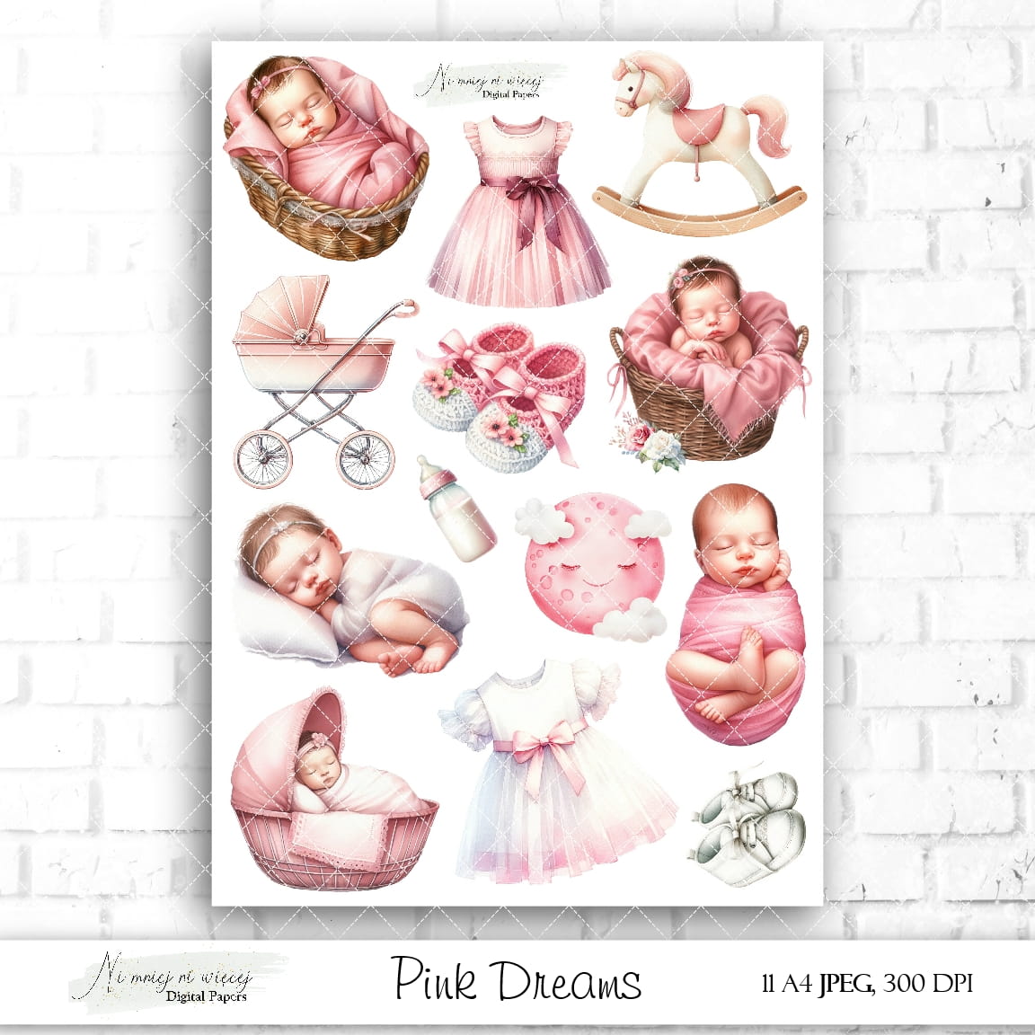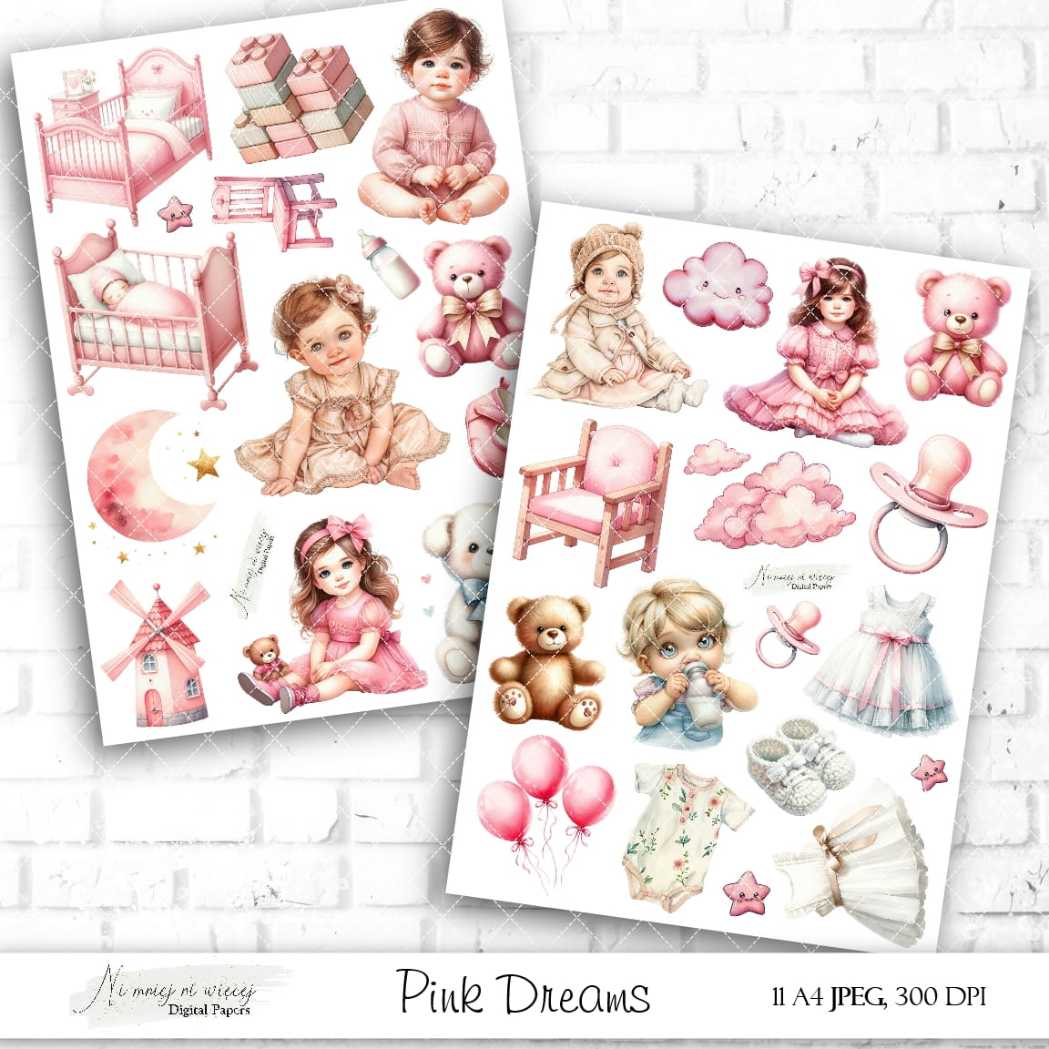 Kolekcja "Pink Dreams" zawiera 11 arkuszy A4 JPEG grafik do samodzielnego wydruku i 132 grafiki png. Pliki są wysokiej jakości 300DPI.