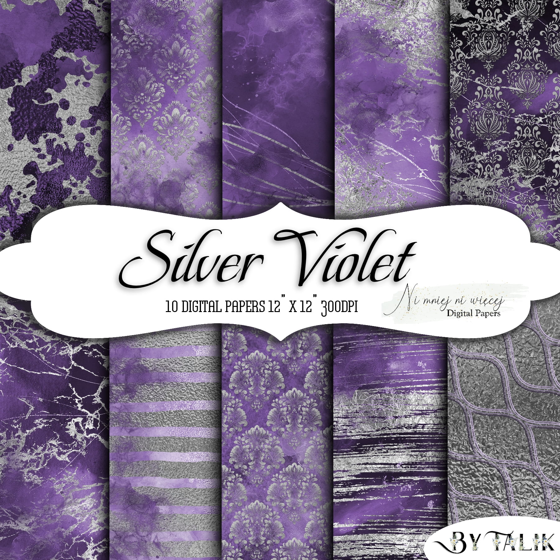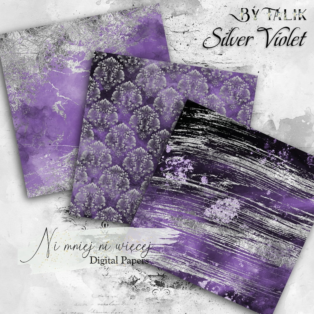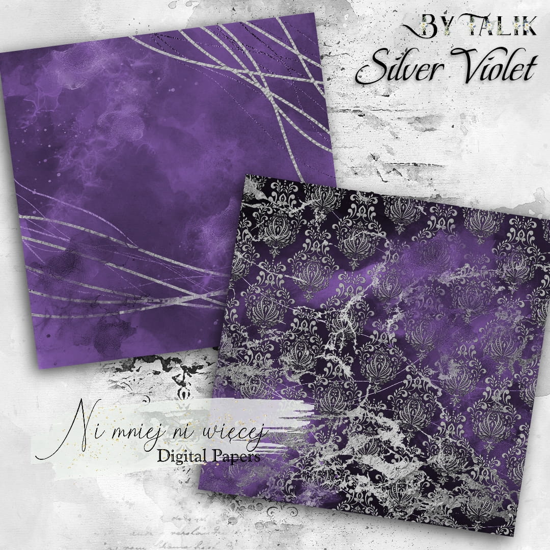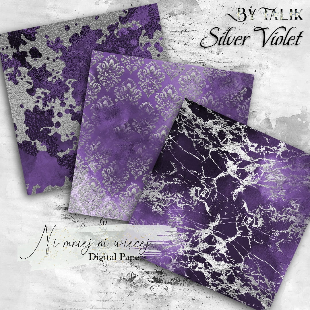 Kolekcja "Silver Violet" zawiera 10 arkuszy plików cyfrowych do wydruku w rozmiarze kwadrat. Pliki są wysokiej jakości 300DPI.