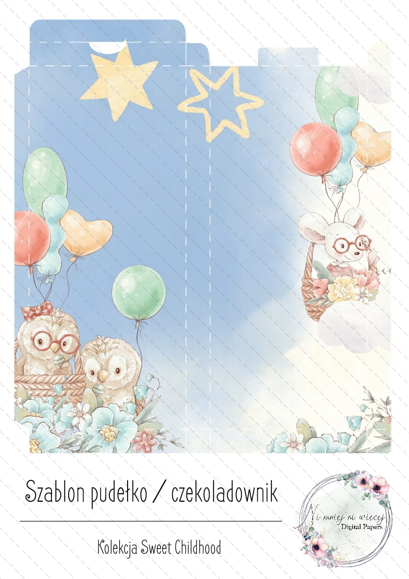 1 szablon (plik JPEG) do samodzielnego wydruku- czekoladownik. Po złożeniu mieści standardową czekoladę.