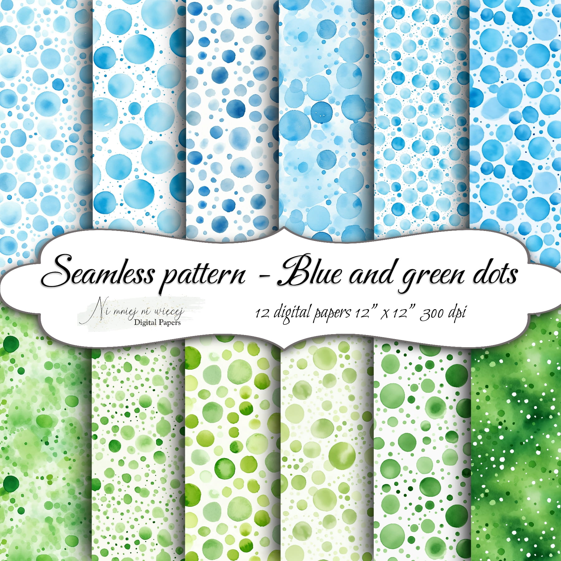 Kolekcja "Seamless pattern blue and green dots" zawiera 12 plików cyfrowych do wydruku w rozmiarze kwadrat. Pliki są wysokiej jakości 300DPI.