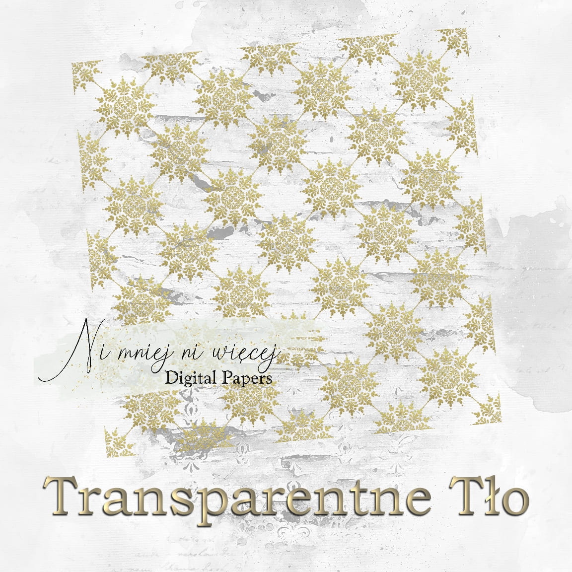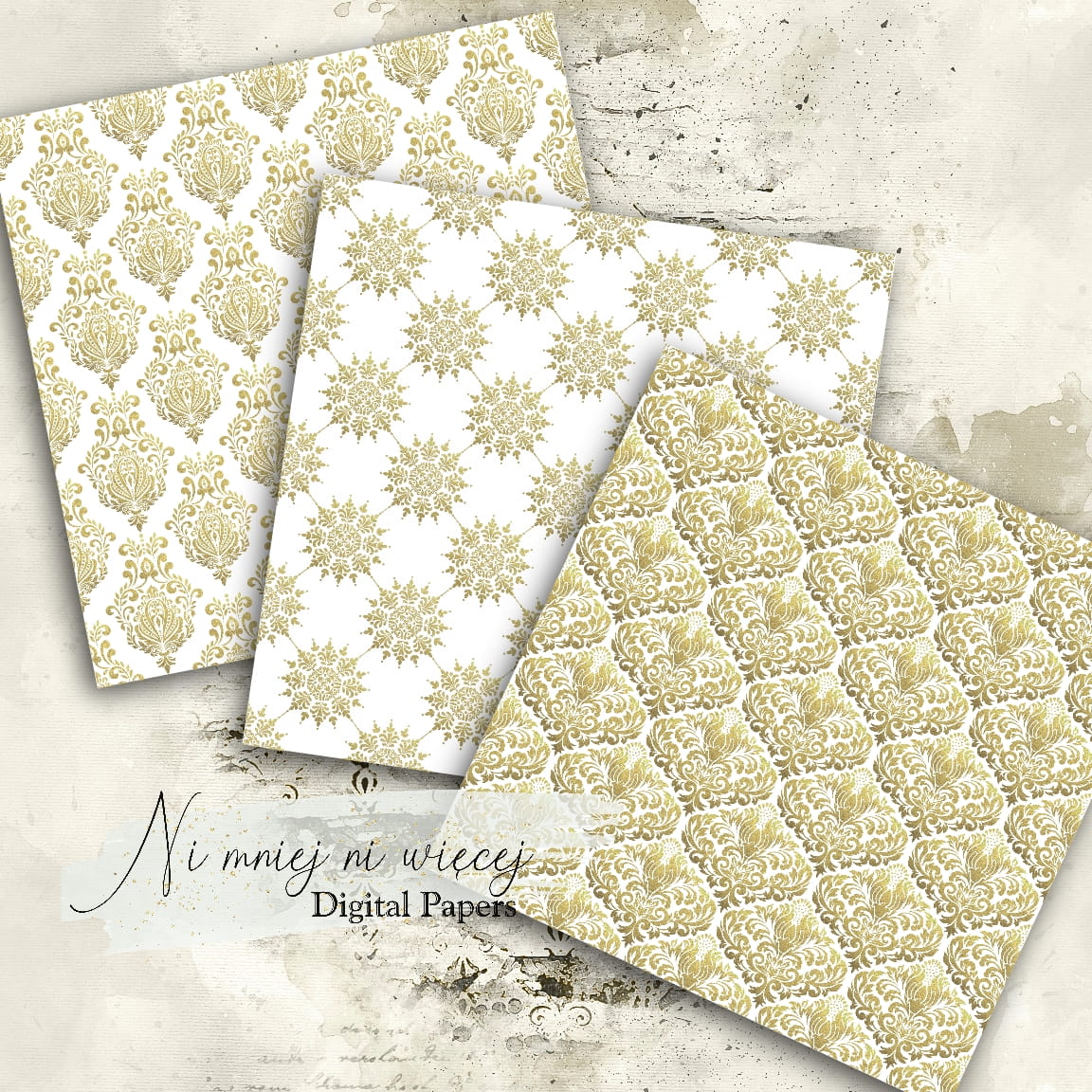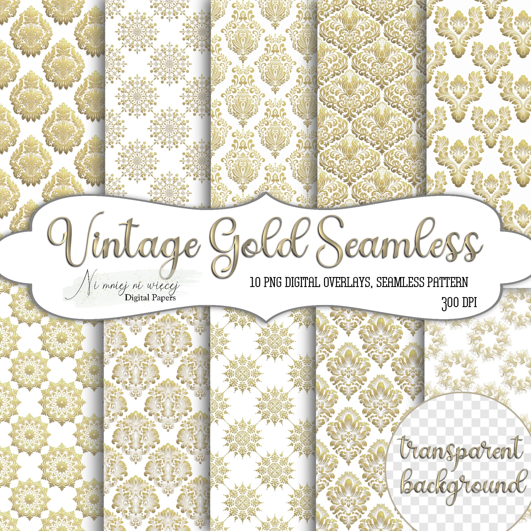 Kolekcja "Vintage Gold Seamless" zawiera 10 plików cyfrowych - nakładek PNG w rozmiarze kwadrat. Pliki są wysokiej jakości 300DPI.